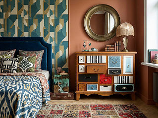 Для штор ищем другие ткани: это легкие прозрачные или полупрозрачные варианты с геометрическим рисунком, тоже яркие, но в той же цветовой гамме. Они должны выглядеть непринужденно: несколько цельных отрезов произвольно обкрутите вокруг карниза и свяжите толстым шнуром золотого цвета. Так же небрежно можно накрыть что-то из обновленной мебели куском этой ткани или цветастой шалью.